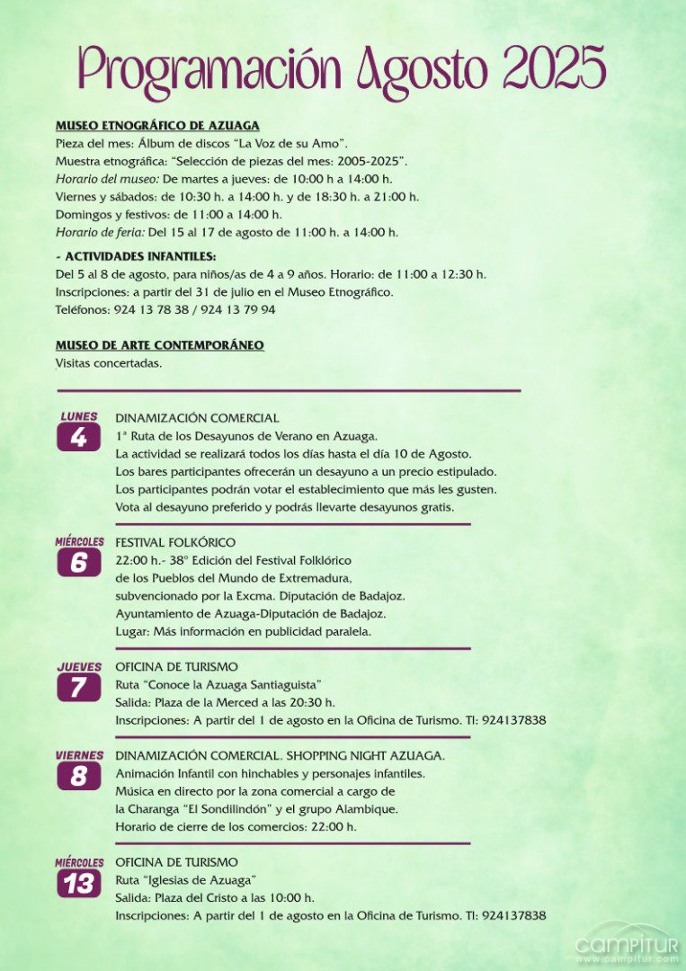 - Miércoles 27: Ruta “Museos de Azuaga” – salida desde Plaza de la Merced a las 10:30 h.